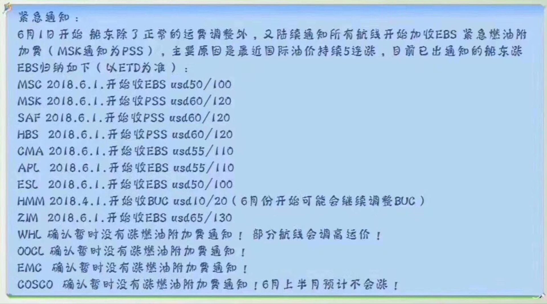 我們剛剛得到確切的消息,由于國際油價連續(xù)增長,各大船公司通知從6月1日起(開船日),加收緊急燃油附加費。